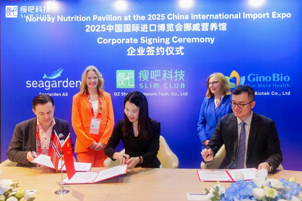 金羊网讯 在第八届中国国际进口博览会上,瘦吧科技与挪威海洋原料企业Seagarden正式签署战略合作协议,挪威创新署执行副总裁EvaCamerer、亚太及中东地区总监HeidiDahl等代表出席见证。