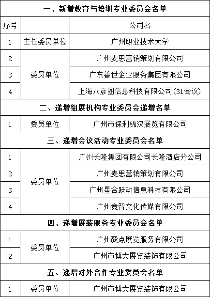 为适应行业的发展和业务工作的需求,提高协会的服务水平,尤其是专业细分领域服务水平,广州国际会议展览业协会新增组建教育与培训专业委员会,同时递增组展机构、会议活动、展装服务和对外合作专业委员会。活动现场,协会对外公布新增专委会成员名单并授牌。
