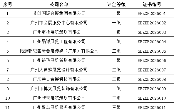为适应广州会展业快速发展的需要,应对国内与国际间会展业的竞争与合作,规范行业发展秩序,提高会展工程的技术和施工水平,确保会展工程的质量和安全,进一步推动行业进步与繁荣,协会发布《广州国际会议展览业协会会展工程企业水平等级标准》并开展会展工程企业水平等级申报工作。经企业申报、资料初审、评委会评审、公示等程序,协会对获得2025年度第一批会展工程企业水平等级资质的企业颁发会展工程水平等级牌匾。